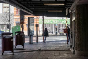 Een buurt vol contrasten: leegstand waar ooit bedrijvigheid was, kale parkings die wachten op beweging, achtertuinen die fluisteren van verleden en toekomst, en het imposante stationsgebouw dat alles lijkt te overzien. De architectuur verraadt iets van de functie, maar ook van de stilte die erop volgde. Geen chaos, geen drukte , enkel sporen van passage.